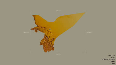 Area of Ma'rib, governorate of Yemen, isolated on a solid background in a georeferenced bounding box. Labels. Topographic relief map. 3D rendering
