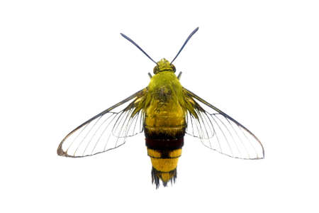 Brown hawk moth front view macro photo on white. Adult Sphingidae butterfly studio shot. Tropical moth closeup on white background. Hawk moth front view for science or education illustration