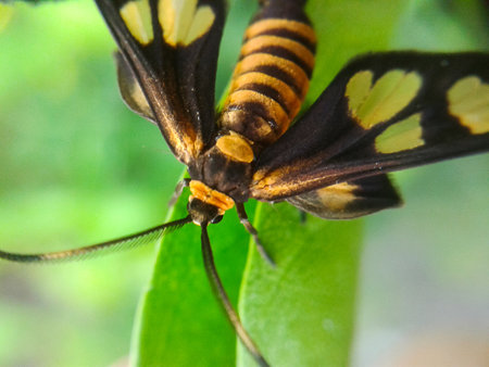 The moth perched on the leaf. Tropical insect with the scientific name Euchromia horsfieldi