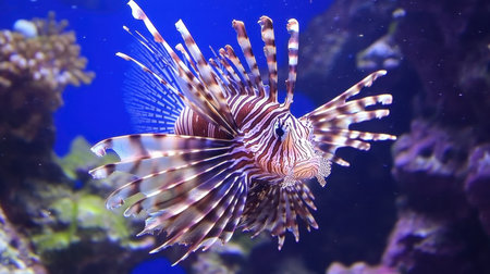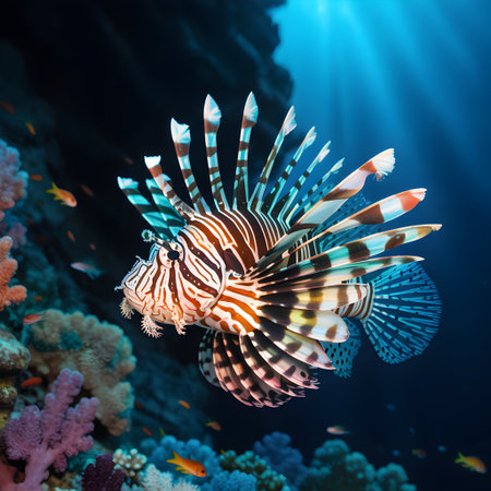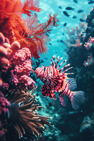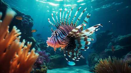 A vibrant lionfish glides through a colorful coral reef, showcasing its majestic fins and unique patterns. An exquisite view of underwater life.