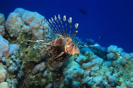 Lionfish Pterois volitans swims on a coral reef.