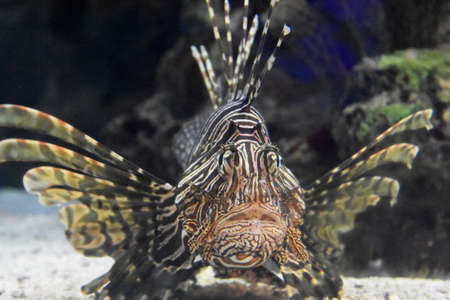 Common Lionfish or Devil firefish (Pterois miles) close-up in aquarium