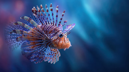 A close-up captures a vividly colored lionfish, showcasing its striped fins and intricate patterns. The image features a blue and pink color palette, with soft textures and selective focus. This underwater scene, likely set in an aquarium or ocean environment, is suitable for various commercial uses, including educational materials and decorative designs.