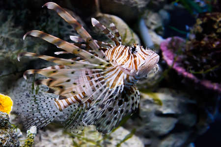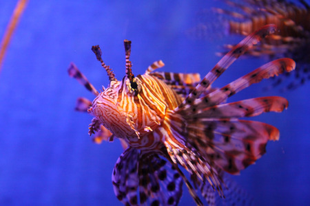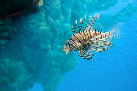 Marine life concept. Lion fish (pterois miles) in captivity, swimming on marine background.
