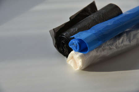 female hand holds a bundle of transparent garbage bags on a blue background. A part of the body sticks out of a torn hole in the paper, copy space
