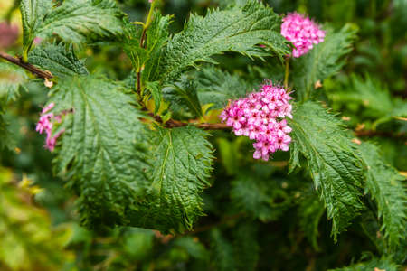Pink flowers of the shrub Spiraea japonica.