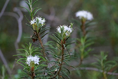 Blooming plant Marsh Labrador Tea or Wild Rosemary (Rhododendron tomentosum, formerly Ledum palustre) growing in forest. It is a poisonous plant.