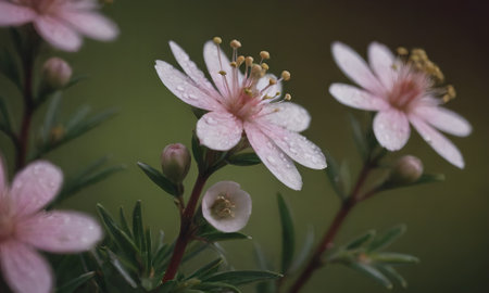 Close up of pink flowers with water drops on a green background.