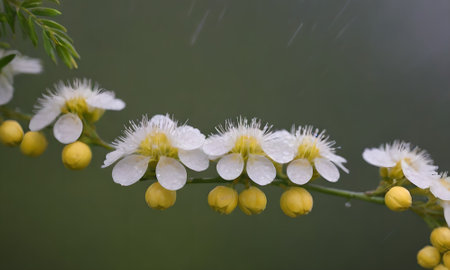 Close up of yellow mimosa flower with water droplets on it