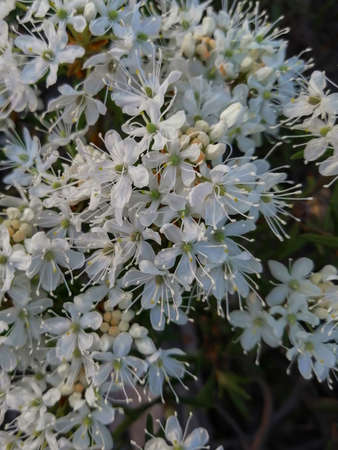 Small white inflorescences of the wild rosemary shrub from the heather family, the genus rhododendron, growing in the northern tundra. Summer nature of the tundra. Unique polar flora.
