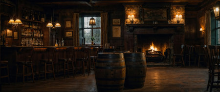 Warm and inviting Irish pub interior featuring a burning fireplace, wooden barrels, and a traditional bar, creating a cozy and authentic atmosphere