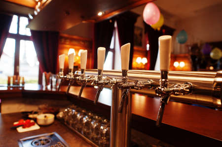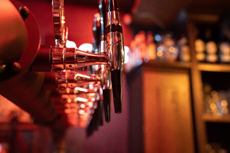 Close-up beer pumps taps in pub or bar in multicolored neon light.