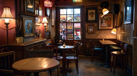 A serene evening scene inside a cozy bar highlighting the warm ambiance and inviting interior.