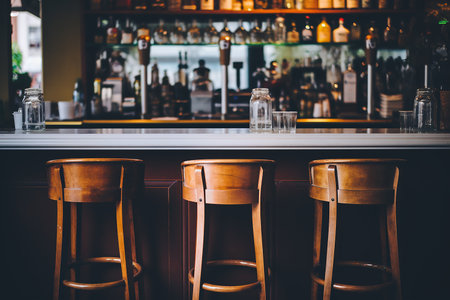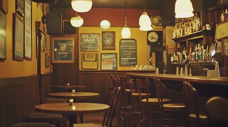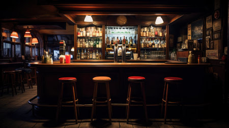 Dimly lit pub interior evokes warmth, with its bar counter and wooden chairs. Generative AI