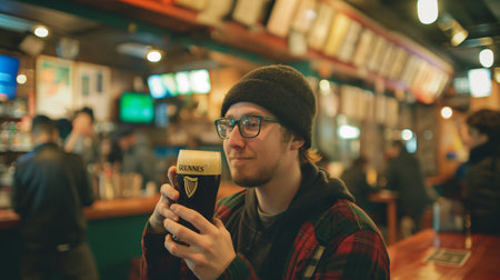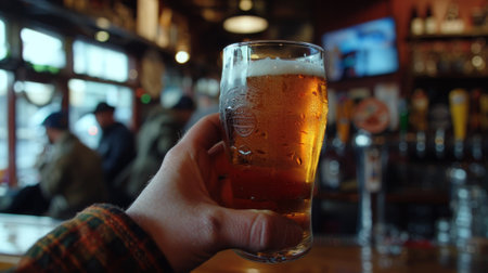 A person is holding a glass of beer in a bar. The atmosphere is casual and relaxed, with people sitting and enjoying their drinks