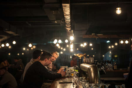 BELGRADE, SERBIA - DECEMBER 4, 2021: Selective blur on a man sitting at the counter of a pub, checking his smartphone, in front of tap beer, in a bar of belgrade.