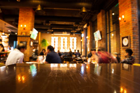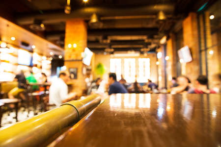 Real wood table and people with light reflection on scene at restaurant, pub or bar at night. Blurred background for product display or montage your products with several concept idea and any occasion.
