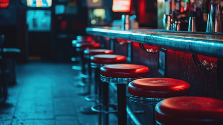 A captivating view of a vintage bar interior featuring red vinyl stools and low ambient lighting, creating a welcoming atmosphere for social gatherings.