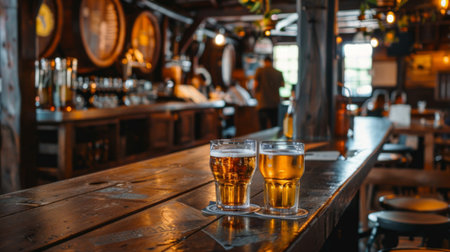 Two glasses filled with beer are sitting on a wooden bar counter. The glasses are condensing due to the cold beer inside, creating a refreshing sight. The bar looks well lit and inviting.