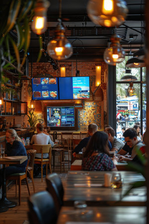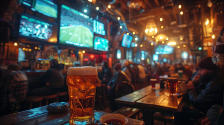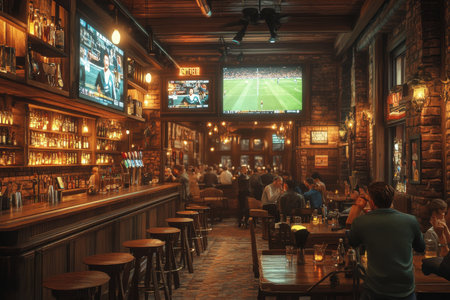 Exciting sports event at a lively sports bar downtown digital media cozy atmosphere nighttime community connection