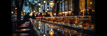 Cozy bar setting with illuminated ambience during a lively evening gathering in downtown area