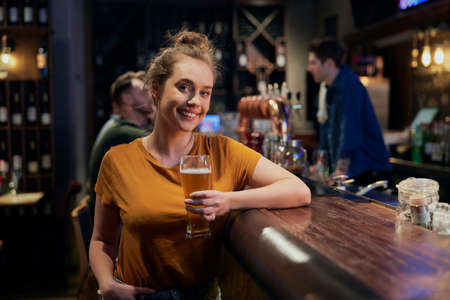 Cheerful bartender serving beer to young men while standing at the bar counter in pub