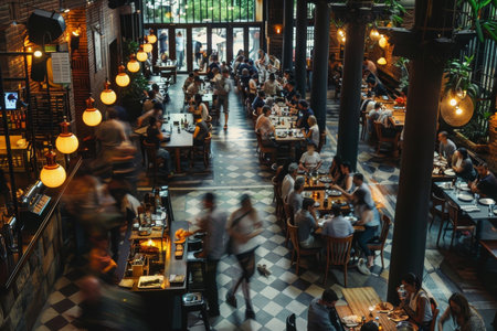 Blurry view of a crowded restaurant with people dining and interacting, A bustling dining area with people moving about