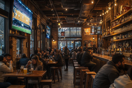 Sports bar gathering urban pub social event cozy atmosphere wide angle community celebration