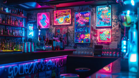 Every corner of the bar is adorned with neon signs and colorful posters featuring abstract artwork
