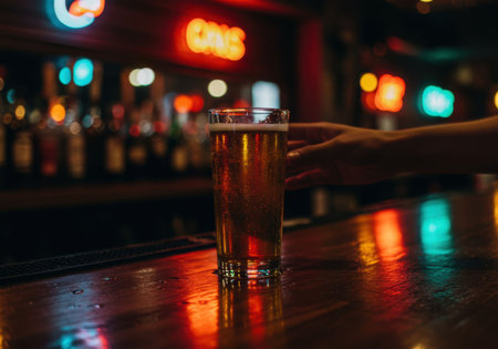 Close up of a man's hand reaching for a glass of beer on a wooden bar counter in a dimly lit pub. Beer Day celebration.