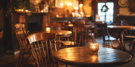 Cozy Candlelit Cafeteria Interior with Wooden Chairs and Tables.
