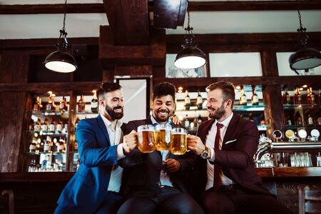 People, friendship and celebration concept. Happy business male friends drinking beer at pub