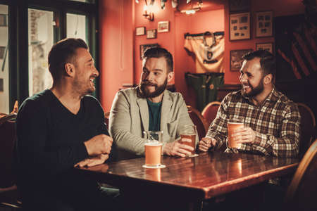 Group of friends drinking beer and having fun in a pub or restaurant.