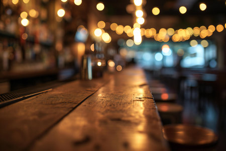 Wooden bar table in front of abstract blurred background of restaurant in the dark