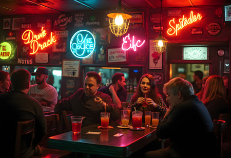 A classic dive bar illuminated by neon signs, where patrons enjoy vodka cocktails in a lively atmosphere under warm, inviting light.