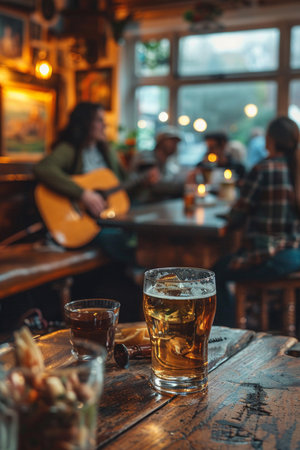 Live acoustic music in a pub, relaxed scene with friends enjoying drinks and unwinding