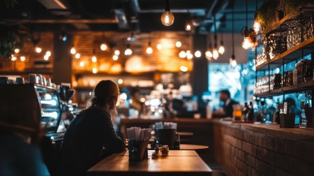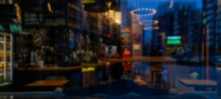 Blurred interior of the evening cafe. Lonely restaurant visitor.