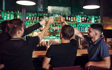 Happy young men in casual clothing drinking beer and bonding together while sitting in the pub