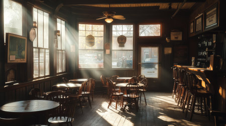 Dappled sunlight fills a cozy cafe during a quiet afternoon, highlighting wooden tables and chairs, inviting guests to relax and enjoy their surroundings.