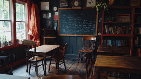 A charming rustic classroom interior with wooden furniture, a chalkboard, and vintage decor that creates an inviting atmosphere perfect for learning and creativity.