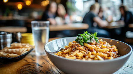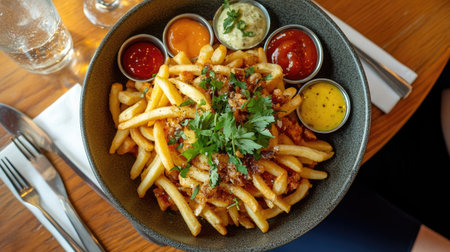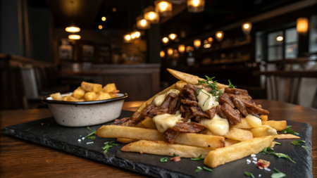 A visually appealing gourmet meal on a wooden table, featuring delicious loaded fries topped with creamy goodness and fresh greens, perfect for any dining occasion.