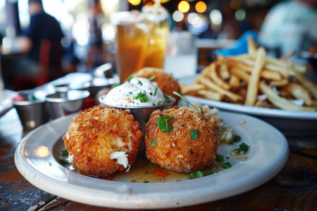 Closeup of delicious crab cakes served with dip and fries on a plate, with beverages in the background