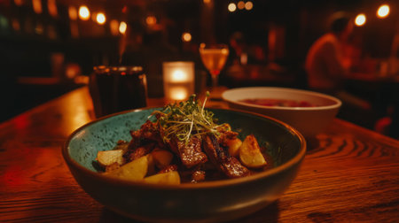 Elegant dining experience with duck confit and crispy skin in cozy restaurant ambiance