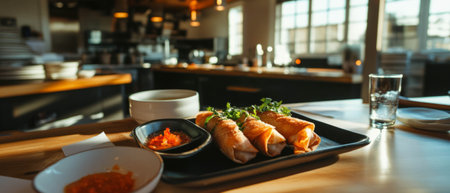 Enjoy delicious spring rolls with dipping sauce in a cozy Asian-inspired setting