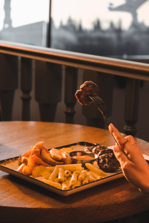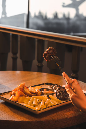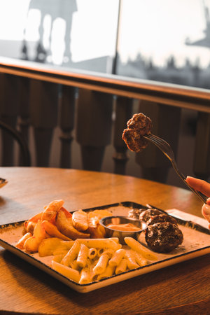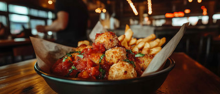Delicious meatballs in marinara sauce served with crispy fries in a cozy eatery