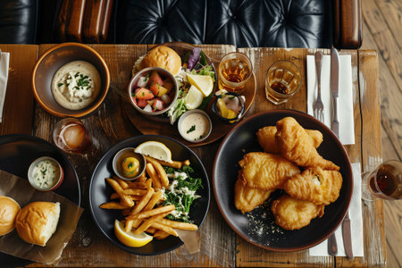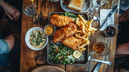Top view of traditional British fish and chips served with golden fried cod, French fries, fresh salad, bread rolls and sauces on rustic wooden table. Perfect pub food, fast food