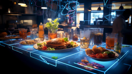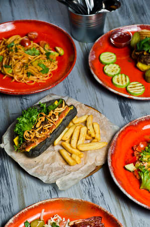 Served table with various dishes of the restaurant. Hot dog, barbecue pork ribs, steak, Carbonara paste and crab salad.