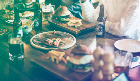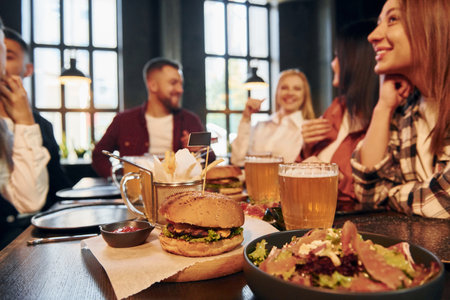 Group of Friends Enjoying a Delicious Meal and Cold Beverages Indoors on a Relaxing Afternoon