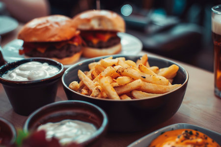Salted french fries with garlic sauce and ketchup and burgers on fast food restaurant table.AI Generative.