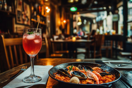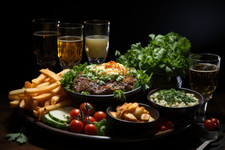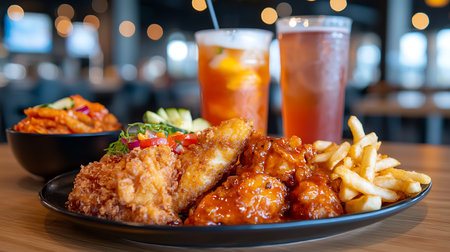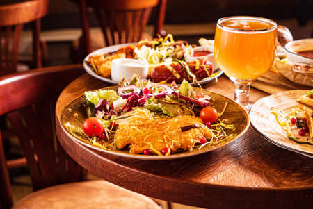 Delicious restaurant meal with fresh salad, fried snacks and refreshing drinks on wooden table with colorful background.